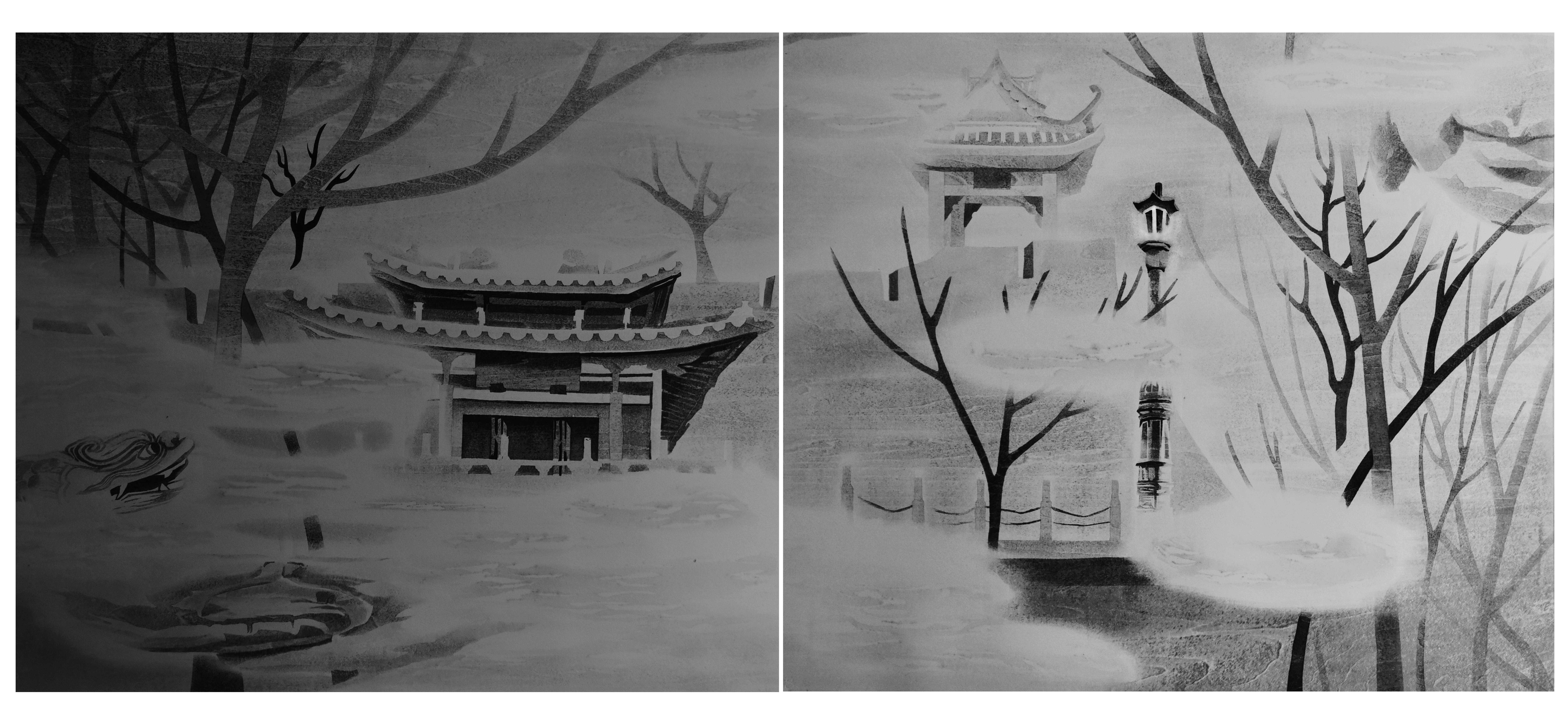 本系列创作是以家乡潮州八景名胜古迹为主题元素,主要营造出一种岁月在建筑上留下种种时间的痕迹。创作题材都是潮州历史悠久的建筑元素及佛元素,从而构成这个超现实的艺术风格,借此以表达画家对于家乡的热爱。截止至今,在版画创作中,画家对画面中所追求的静境从未停止过,不管是以光影云雾的形式去演绎,还是以平面化的形式去表达,都希望能在画面中营造一种平静安逸的意境氛围,来表达个人的情感或者想法。