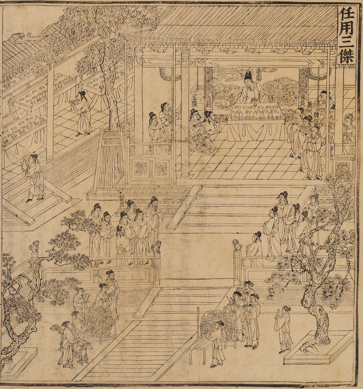 《帝鉴图说》原为手抄手绘之书,然而原书已不存于世,现今流传的均为后世刊印版本,版本众多。其中,一部现藏于日本宫内厅书陵部图书馆的版本因其大开本和精细印制而备受瞩目。日本学者称其为“官版”,但在中国版本学体系中并无此称谓。根据书中序文记载,此版本由明代官员潘允端(1526-1601)赞助刊刻,故通常以“潘允端本”称之。种种迹象表明,此版本极有可能是最接近原书形态的刻本,保留了最初的编纂意图和视觉呈现方式。