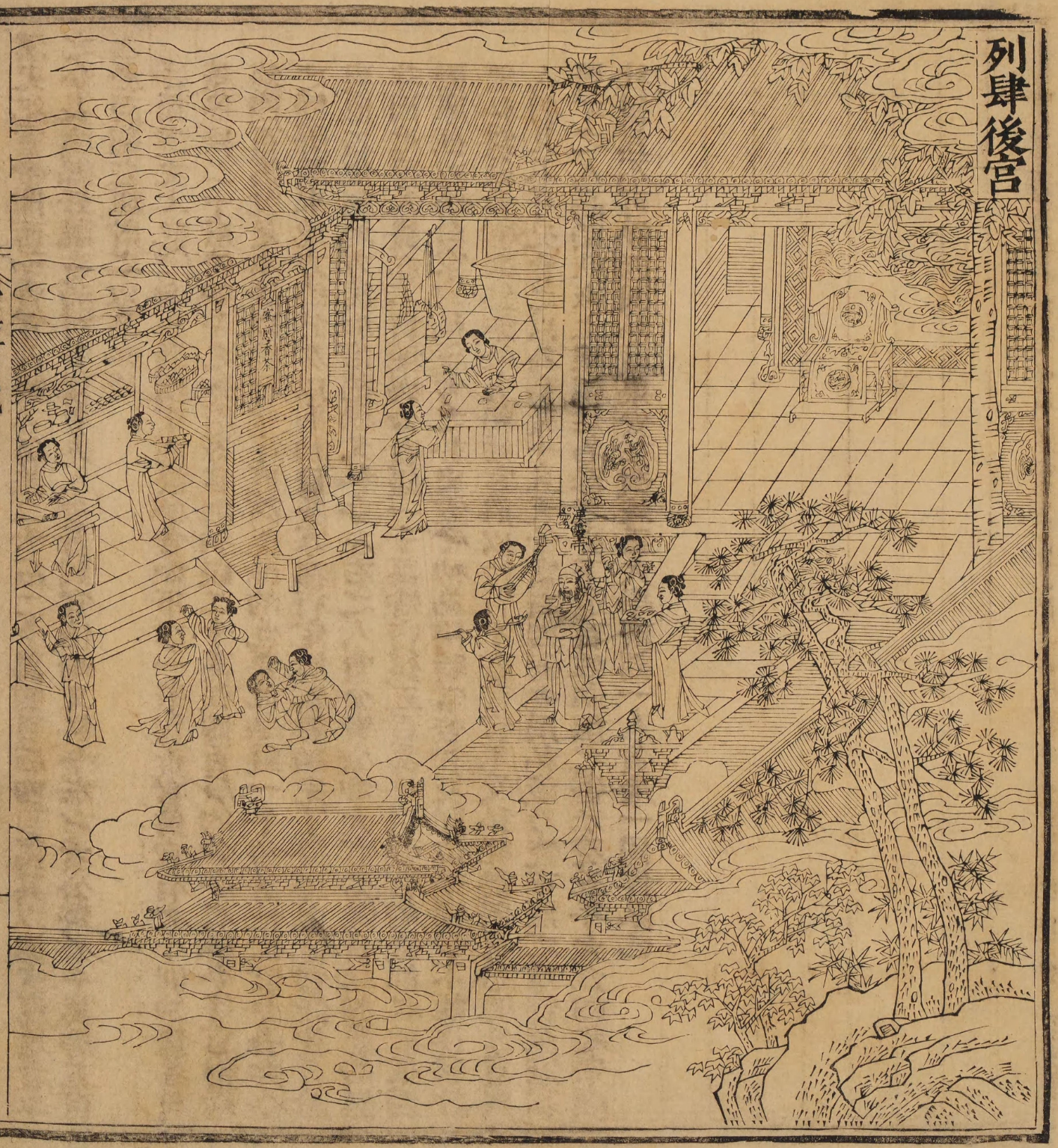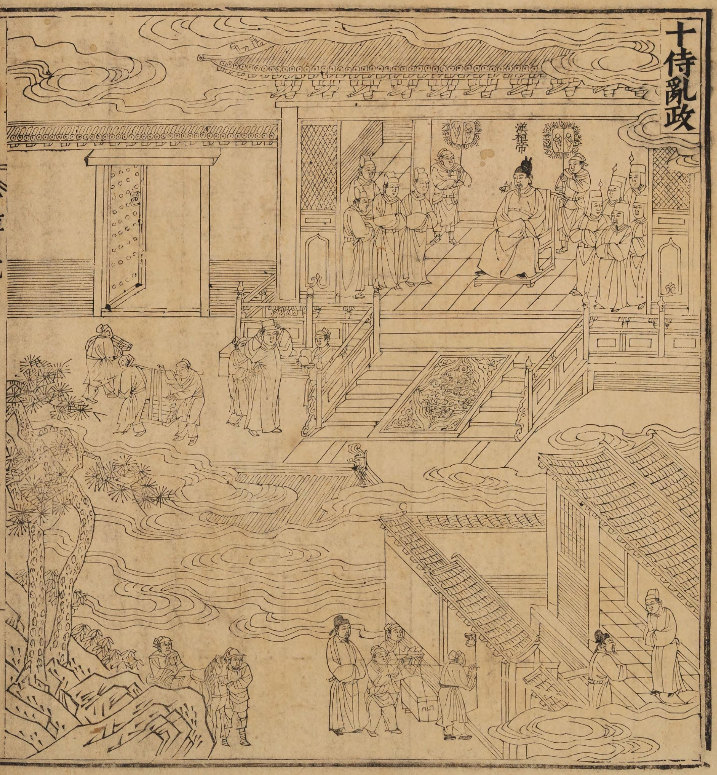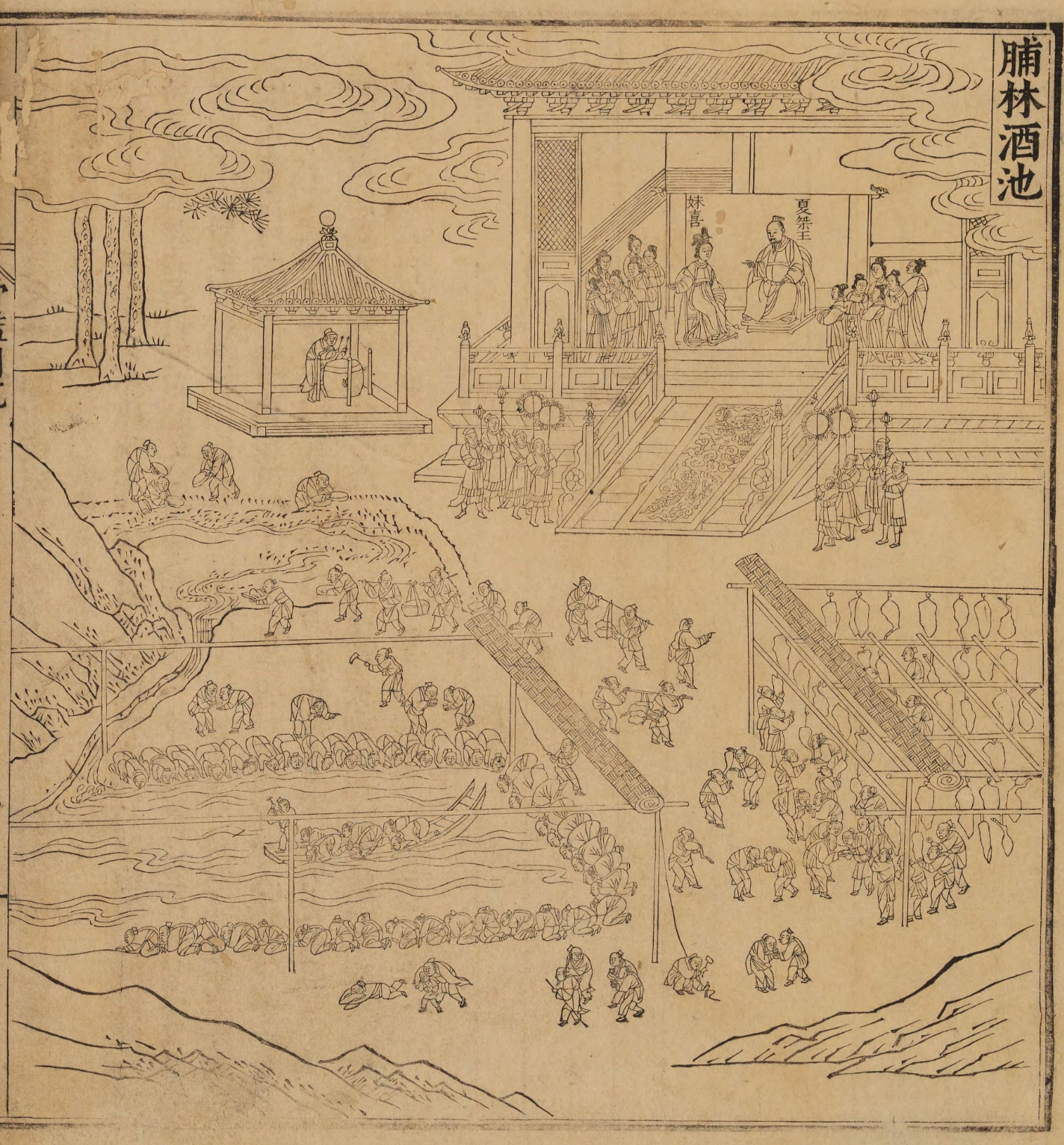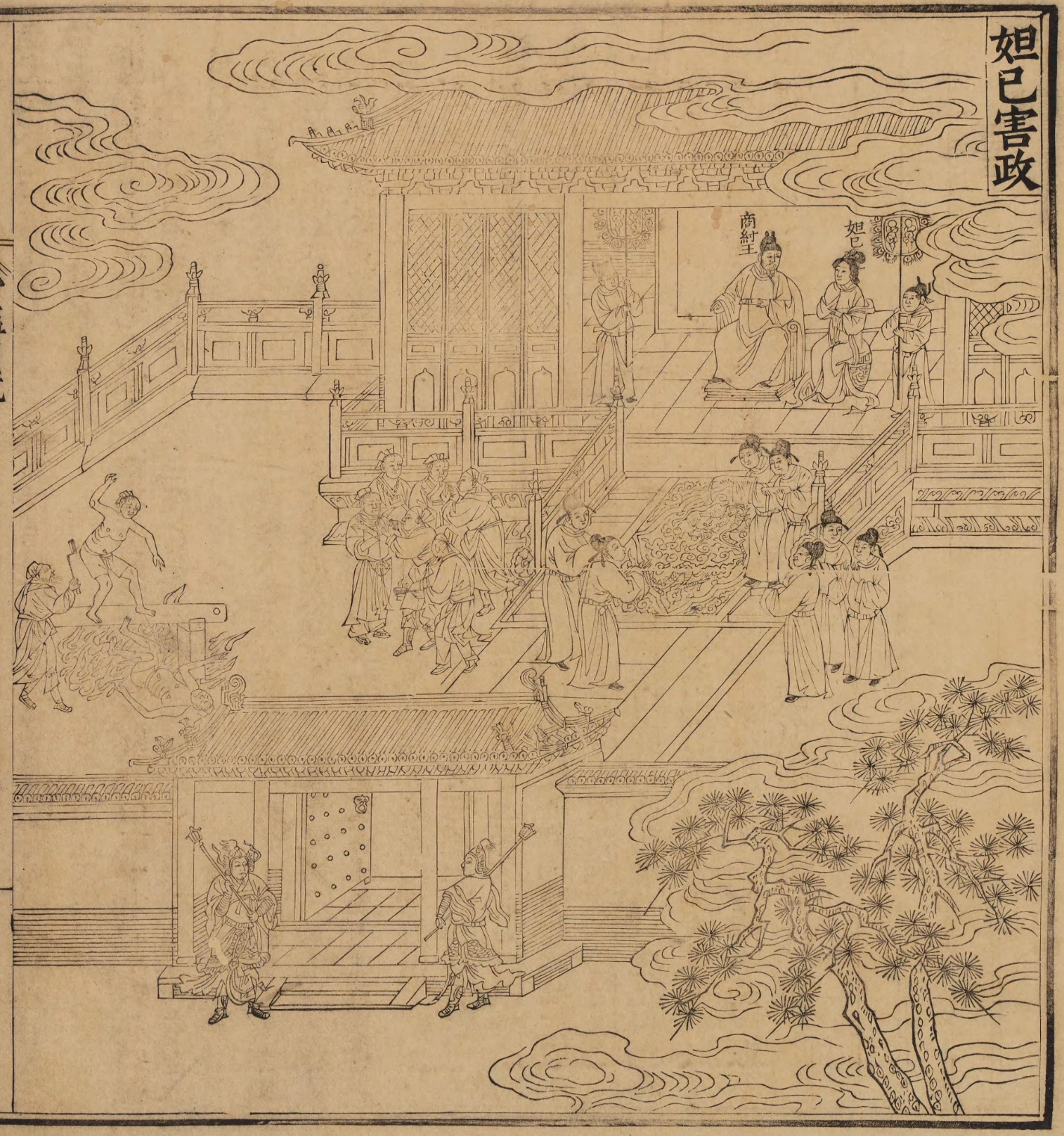 本期精选《帝鉴图说》下篇《狂愚覆辙》部分的版画,如果说上篇是颂扬贤明之君、树立治国理政的榜样,那么下篇则是毫不讳言地揭示了历代昏君的荒淫失政与自毁之道,以“反面教材”之姿,警醒后来者。这些画面不仅延续了明代版画艺术一贯的细腻工笔与严谨构图,也更加强调情绪的张力与场景的戏剧性,充分展现了“以戒为鉴”的传统政治文化教化理念。画中人物多呈现出极端的行为状态与荒唐决策,辅以生动的画面语言,将历史典故的荒谬与后果具象化,使读者得以透过画面直观感受历史的沉重警示。